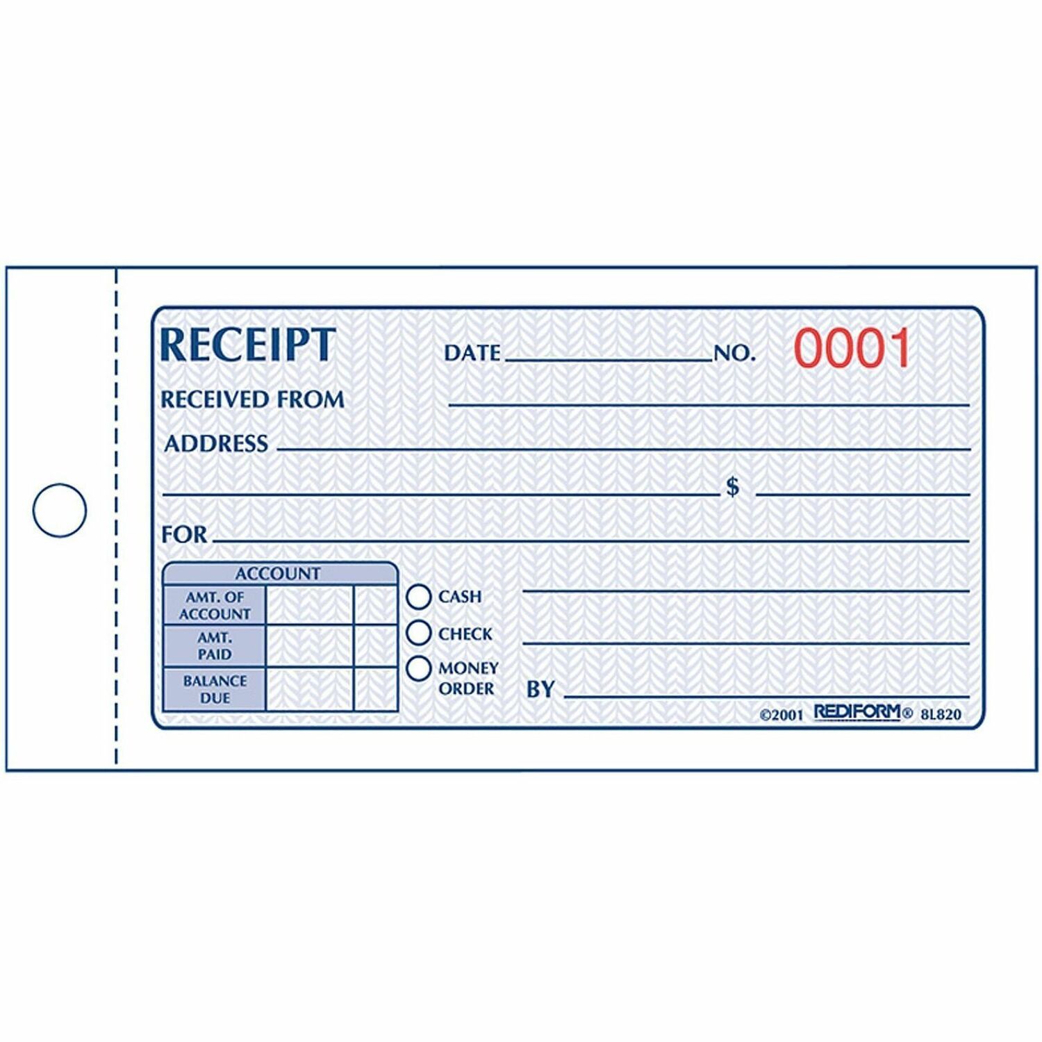 Manifold book with a flexible cover contains carbonless receipt forms that are consecutively numbered in red. Each page contains two-part forms with the original in white and the duplicate in yellow. Duplicates feature black print. Security screen prevents alterations. Each form includes a place for date, payment amount, name of payer, payer's address, item description, and recipient name. A chart along the bottom breaks down the payment and includes boxes to fill in the amount of account, amount paid, balance due and payment method. Three circles preprinted with cash, check and money order are located beside the chart and allow you to check off the method payment. Receipt book contains 50 sets.
